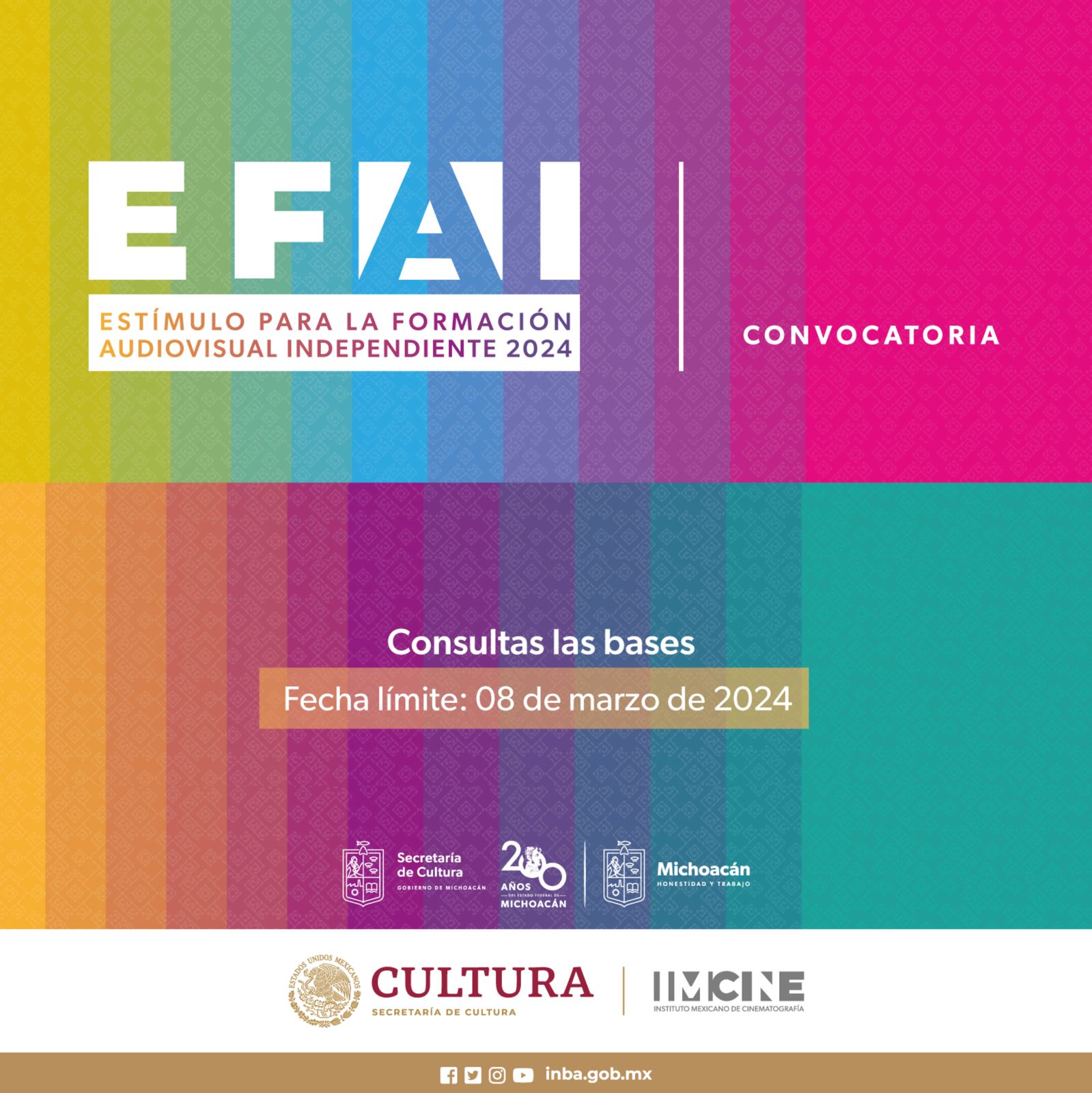 Morelia, Michoacán, 27 de febrero de 2024.- La Secretaría de Cultura de Michoacán (Secum) te invita a participar en la tercera edición del Estímulo para la Formación Audiovisual Independiente (EFAI) 2024. Si representas o formas parte de una iniciativa que trabaje en desarrollar proyectos de formación audiovisual o cinematográfica en alguna comunidad del país esta convocatoria es para ti.