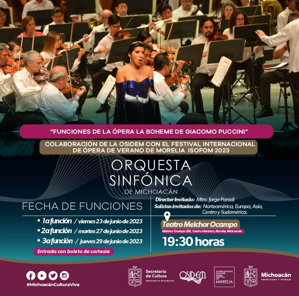 Morelia, Mich., 19 de junio de 2023.- La Secretaría de Cultura de Michoacán (Secum) invita al público a disfrutar de las presentaciones próximas tres funciones de ópera de la Orquesta Sinfónica de Michoacán (Osidem) en colaboración con el Internacional Summer Opera Festival of Morelia (Isofom)