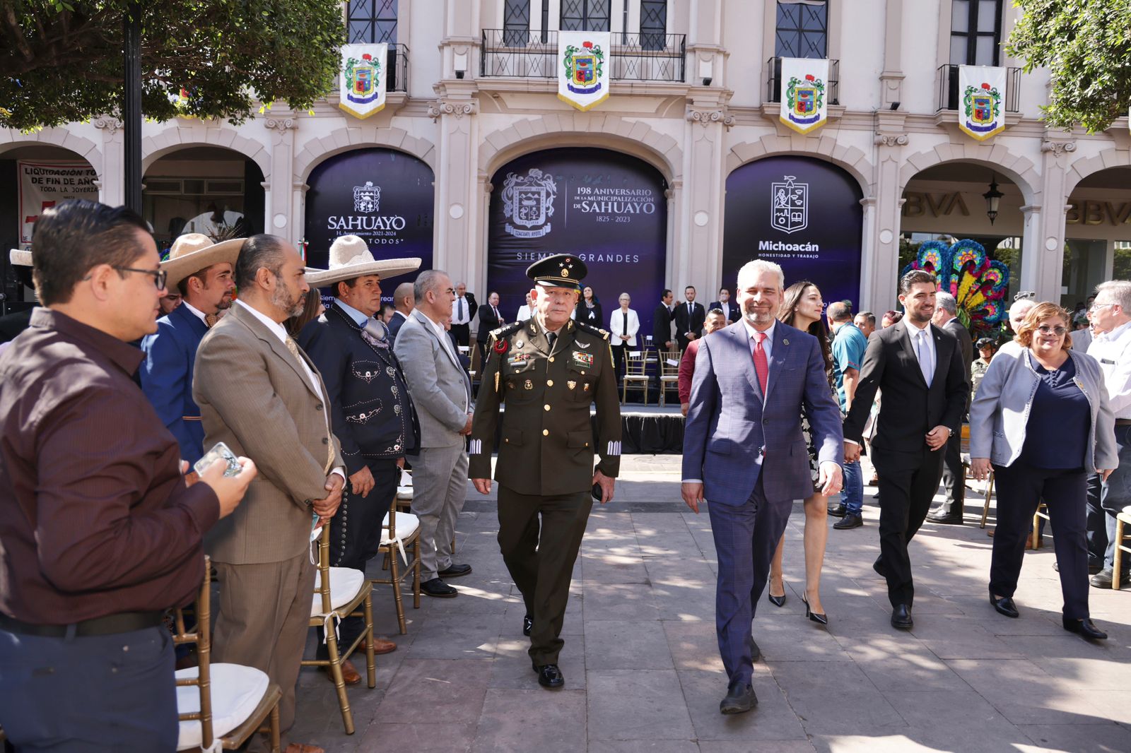 Sahuayo, Michoacán, 15 de marzo de 2023.- Al encabezar el acto del 198 aniversario de la municipalización de Sahuayo, el gobernador Alfredo Ramírez Bedolla, destacó que los cambios que se construyen en México tienen como base la transformación del bienestar del pueblo y de las comunidades.