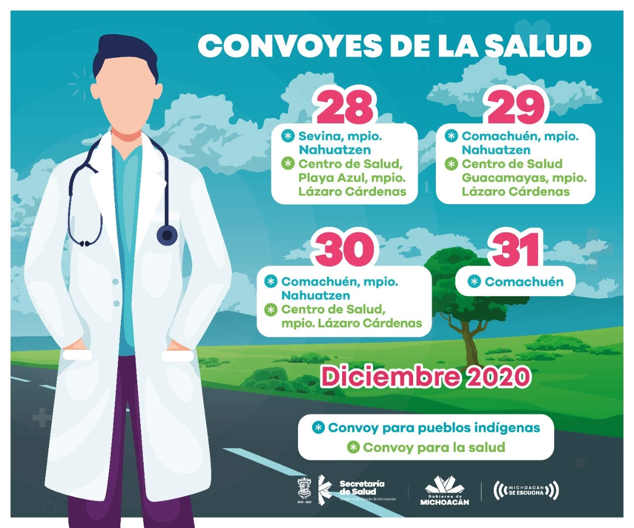 MORELIA MICH., 28 de diciembre de 2020.- La Secretaría de Salud de Michoacán (SSM), informa a la población que los servicios médicos gratuitos que se brindan a través de los Convoyes de la Salud y Pueblos Indígenas continuarán operando de manera ordinaria durante fiestas decembrinas.