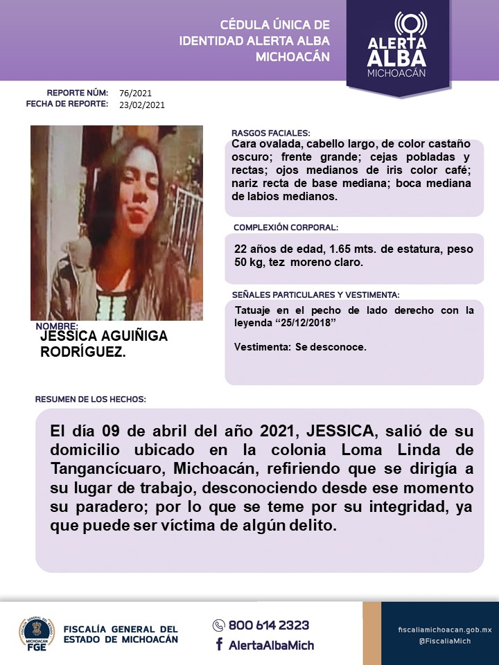 En una ficha de Alerta Alba Michoacán, señalan que la joven mujer de nombre Jessica Aguiñiga Rodriguez, de 22 años de edad, fue reportada por sus familiares, luego de buscarla en varios lugares y al no conocer de su paradero, acudieron a reportar su desaparición.