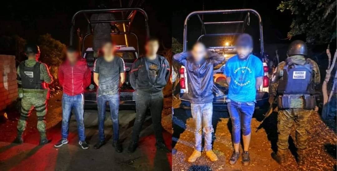 Cinco presuntos integrantes del Cartel de Jalisco Nueva Generación fueron detenidos por los elementos de la Guardia Nacional a los que les aseguraron un arma de fuego, droga, así como dos camionetas y una motocicleta con reporte de robo.