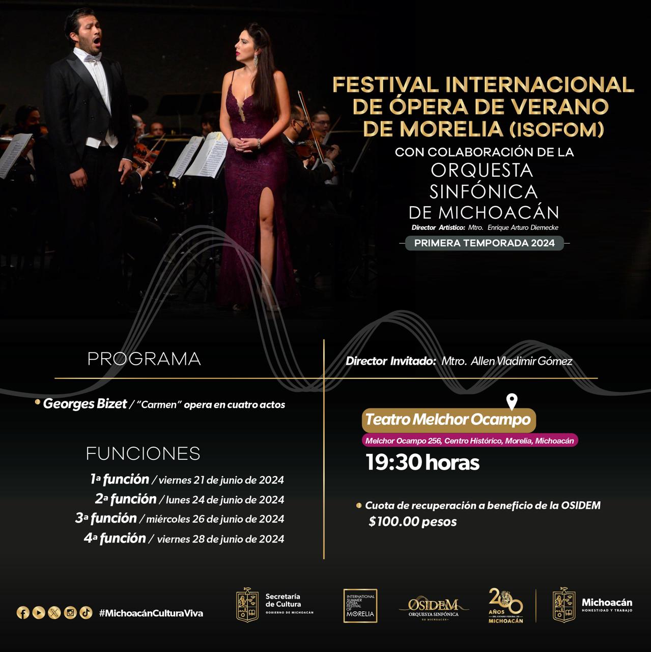 Morelia, Mich., 11 de junio de 2024.- La Secretaría de Cultura de Michoacán (Secum) te invita a las cuatro funciones de la ópera Carmen, de Georges Bizet, que se realizarán en el marco del Festival Internacional de Ópera de Verano de Morelia (ISOFOM), en colaboración de la Orquesta Sinfónica del Estado (Osidem) los días 21, 24, 26 y 28 de junio, a las 19:30 horas, en el Teatro Melchor Ocampo.