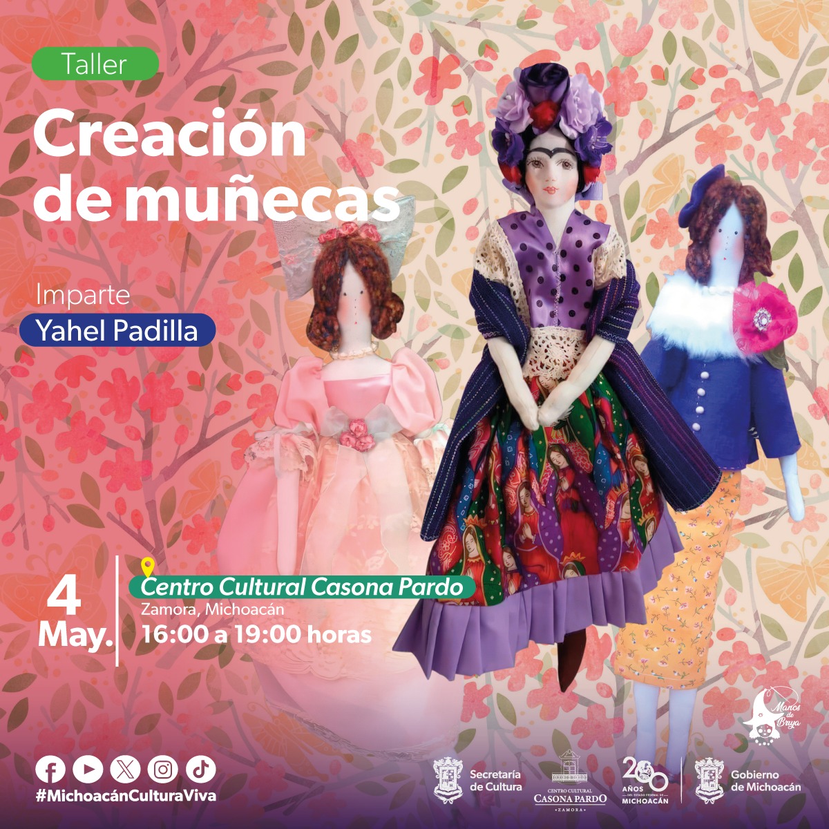 Morelia, Michoacán, 2 de mayo de 2024.- La Secretaría de Cultura de Michoacán (Secum) te invita a confeccionar desde cero tu propia muñeca y sorprenderte con el resultado en el taller que se impartirá Centro Cultural Casona Pardo el próximo 4 de mayo.