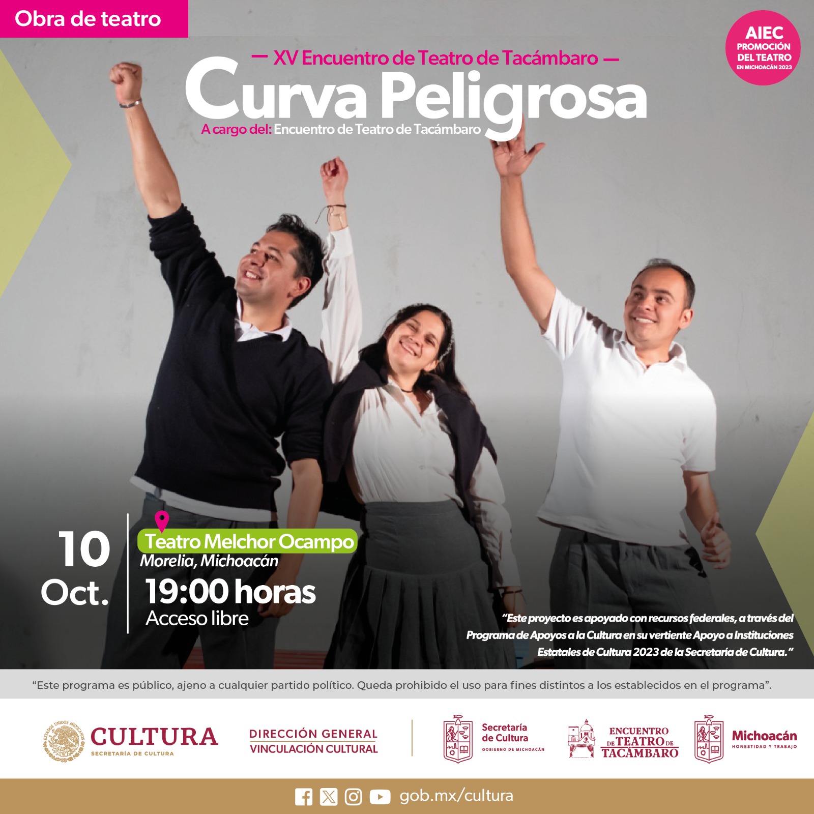 Morelia, Michoacán, 9 de octubre de 2023.- En el marco del XV Encuentro de Teatro de Tacámbaro, la Secretaría de Cultura de Michoacán (Secum) invita a la presentación de la obra Curva Peligrosa, la historia de unos adolescentes en su trayecto por esta carretera llamada vida. La cita es este 10 de octubre a las 19:00 horas en el Teatro Melchor Ocampo.