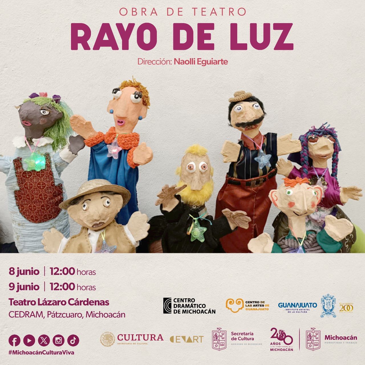 Habrá dos funciones con entrada gratuita, el sábado 8 y domingo 9 de junio a las 12:00 horas, en el Centro Dramático de Michoacán (Cedram), ubicado en la calle Pípila 1, esquina con Lázaro Cárdenas, colonia Revolución Mexicana.