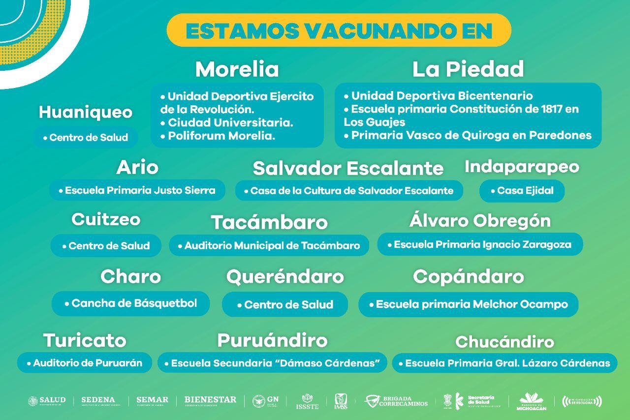 Los municipios que arrancan hoy la primera etapa de inmunización anti COVID-19 son: Huaniqueo, Indaparapeo, Cuitzeo, Álvaro Obregón, Charo, Queréndaro, Copándaro, Chucándiro, Huandacareo, Santa Ana Maya, Susupuato, Tuxpan, Sahuayo, Zacapu, Jiquilpan, San Lucas, Benito Juárez, Los Reyes, Lagunillas, Tiquicheo, Nocupétaro, Pátzcuaro, Tzitzio, Carácuaro, Paracho, Ocampo y Jungapeo.