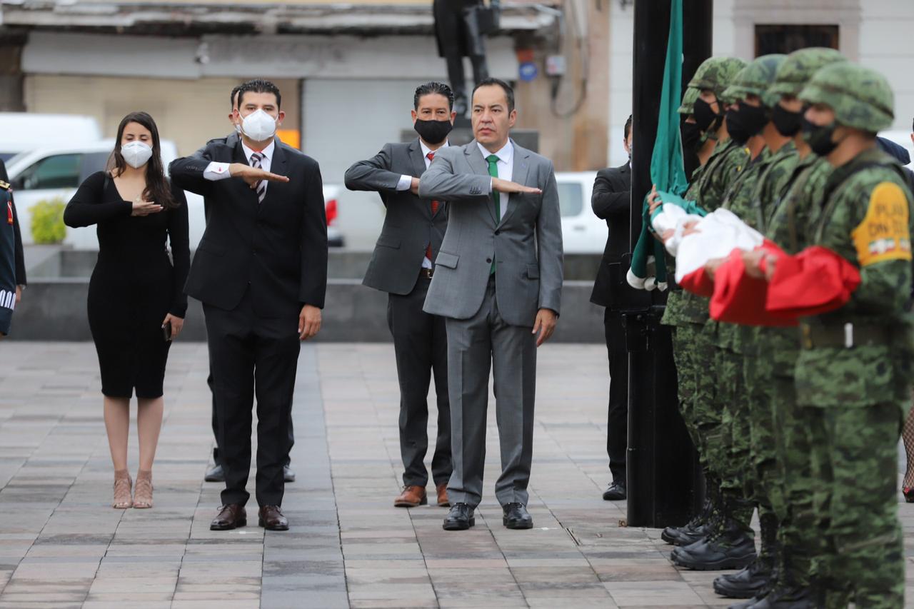 Acompañado de mandos del Ejército en Mexicano, el encargado de la política interna rindió honores a la Bandera de México, cuyo acto se celebró en la Plaza Melchor Ocampo de Morelia.