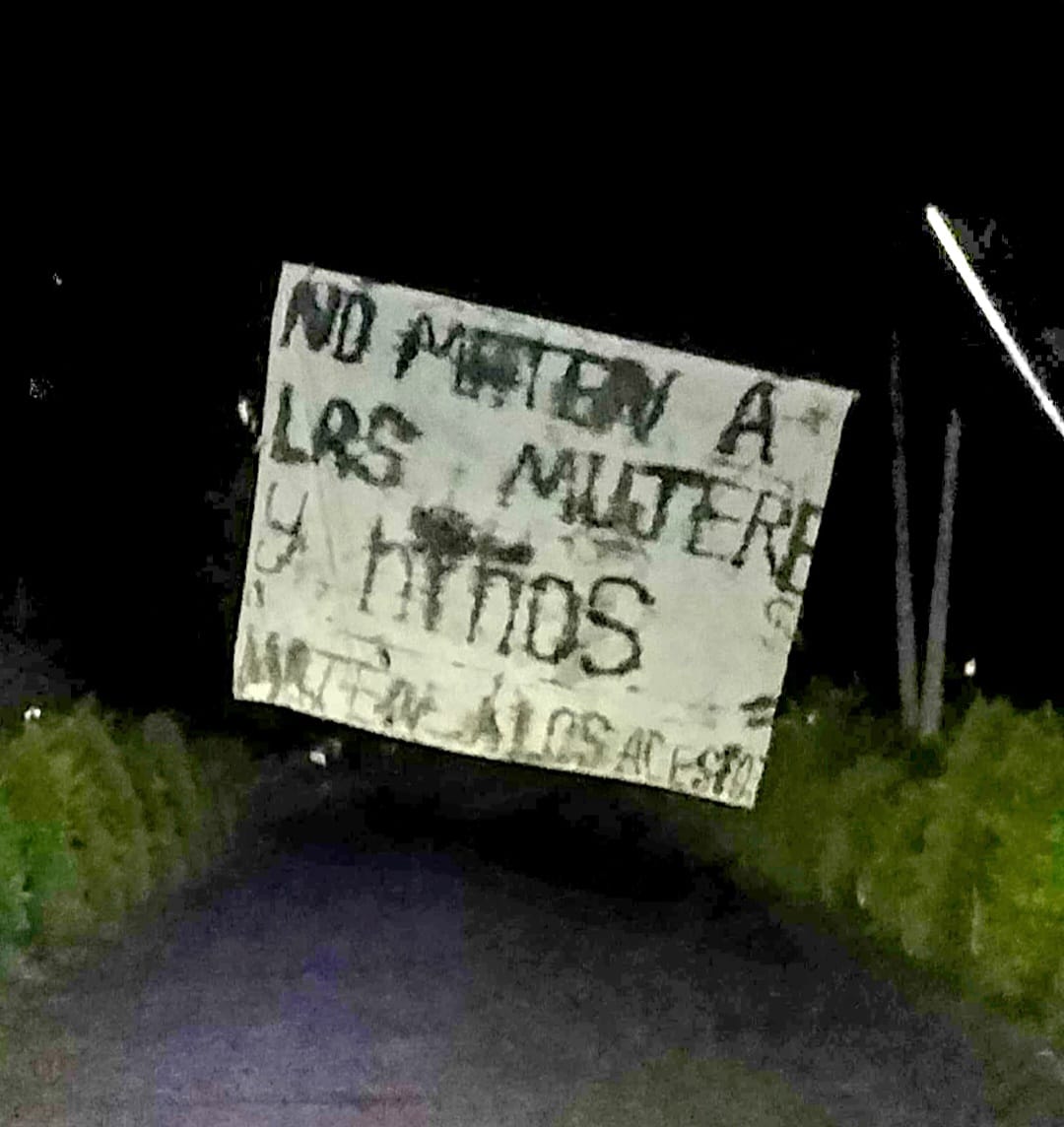 Con letras rústicas y pintadas a mano, se alcanza a leer «No maten a Mujeres y Niños, Maten a los Asesinos», el letrero fue retirado por los elementos de Seguridad Pública.