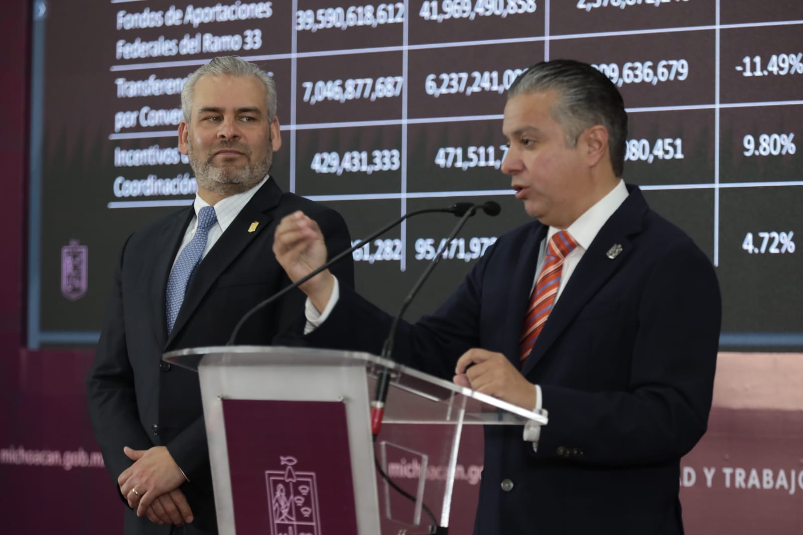 Morelia, Mich., 21 de noviembre de 2023.- En conferencia de prensa encabezada por el gobernador Alfredo Ramírez Bedolla, Luis Navarro afirmó que el paquete fiscal no contempla endeudamiento ni implementación de nuevos impuestos, y será austero, efectivo, realista y equilibrado, por 95 mil 471 millones 978 mil 325 pesos, con un incremento nominal de 4.72 por ciento respecto a 2023.