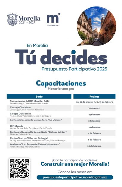 Morelia, Mich; 16 de enero de 2025. Con el objetivo de seguir recibiendo una gran e informada participación de parte de la ciudadanía, el Gobierno del Presidente Municipal de Morelia, Alfonso Martínez Alcázar, invita a morelianas y morelianos a formar parte de las capacitaciones del Presupuesto Participativo 2025.