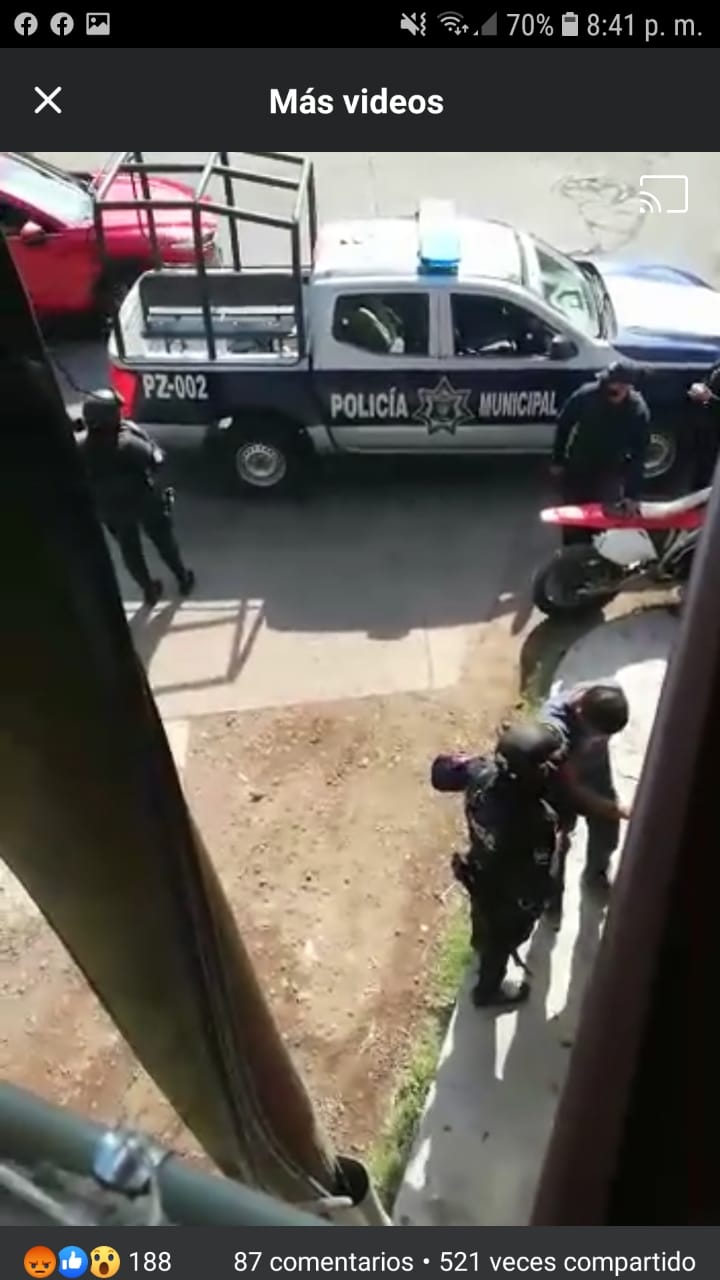 En el video, se muestra una patrulla atravesada, una motocicleta color blanco con rojo y el afectado está contra la pared y con las manos arriba.