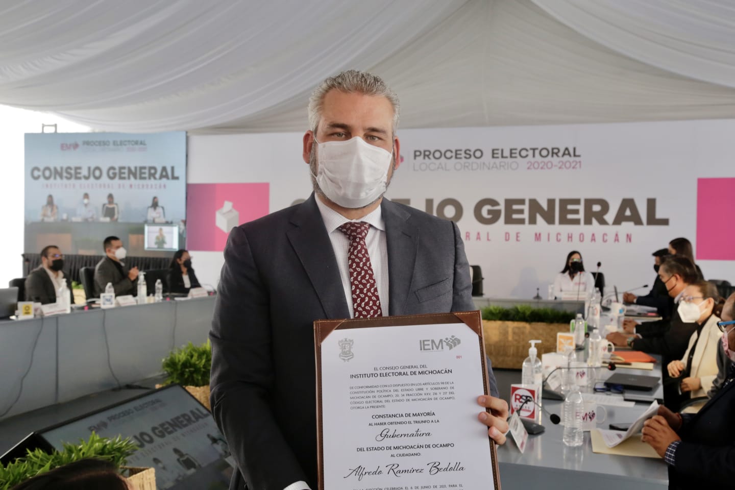 Morelia, Michoacán, 13 de junio del 2021.- El Instituto Electoral de Michoacán (IEM), después de oficializar el computo de votos en los 24 distritos locales, entregó a Alfredo Ramírez Bedolla la constancia de mayoría que lo reconoce como gobernador electo de Michoacán.