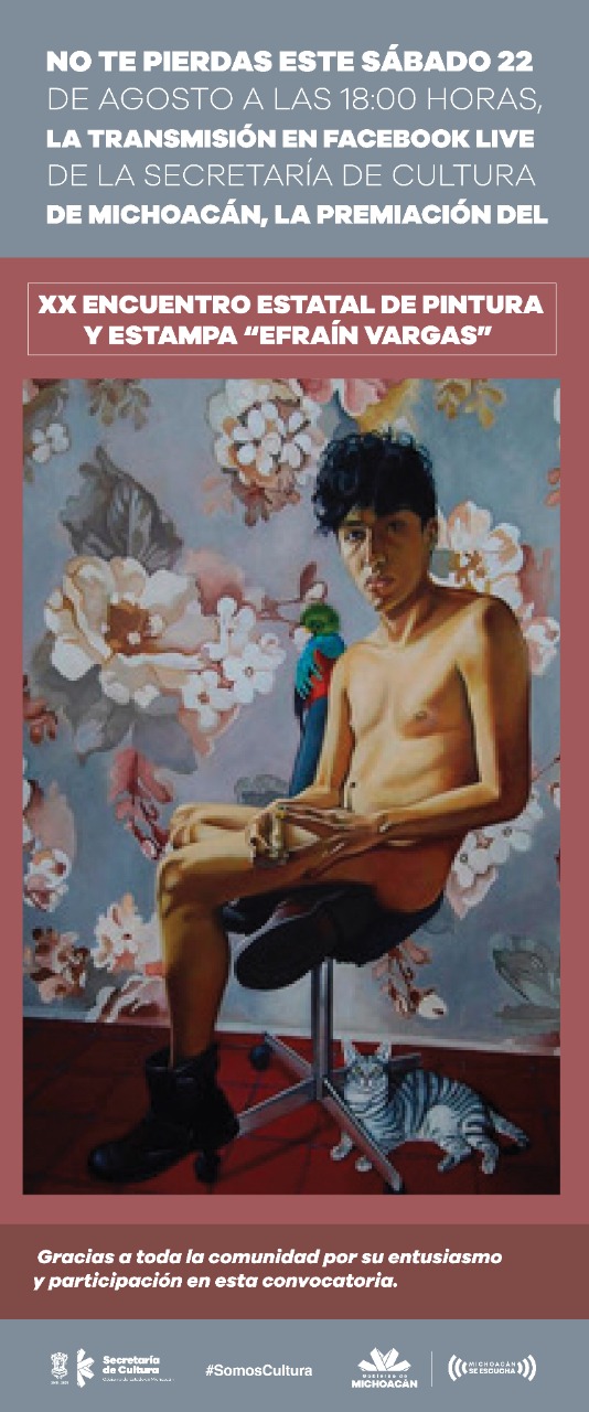MORELIA, MICH., 21 DE AGOSTO DE 2020.- La Secretaría de Cultura de Michoacán invita al público en general a la premiación del vigésimo Encuentro Estatal de Pintura y Estampa Efraín Vargas, la cual se llevará a cabo por medio de una transmisión en Facebook, este sábado 22 de agosto a partir de las 18:00 horas.