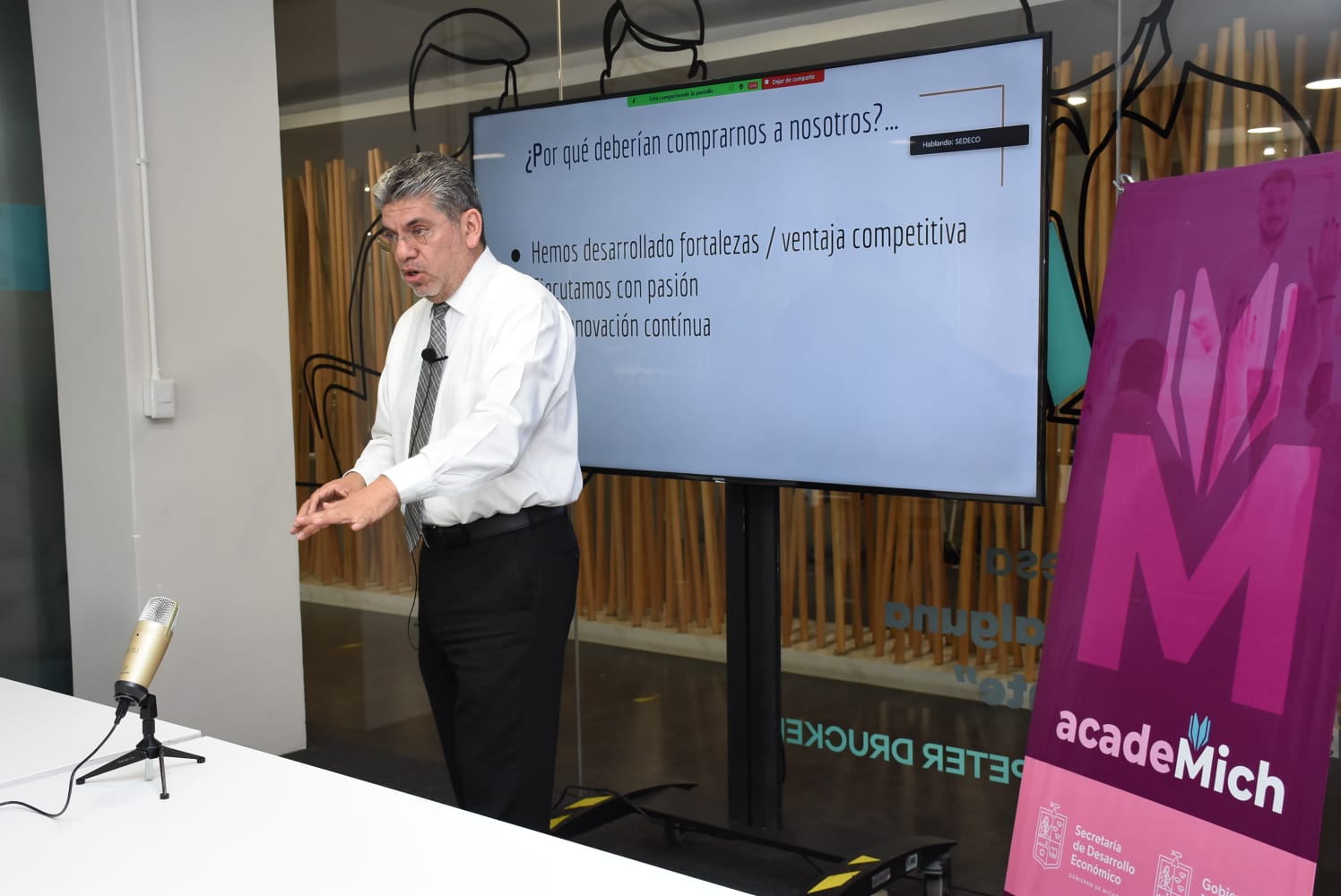 En la fecha de aniversario, correspondió al especialista en Administración, Baltazar Cerda Gómez impartir la charla ¿Por qué deberían comprarnos a nosotros?, en la que expuso la importancia de la innovación y la diferenciación, en la que exhortó a las y los participantes a identificar esos elementos diferenciadores de sus negocios y a explotarlos para fortalecer sus negocios.