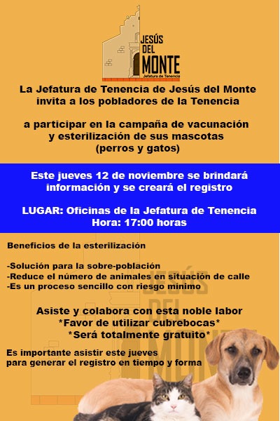Este jueves 12 a las 17:00 horas se dará información en las oficinas de la Jefatura de Tenencia, en ese momento se generará el registro para programar las citas en que se realizarán las cirugías, todo será de manera gratuita.