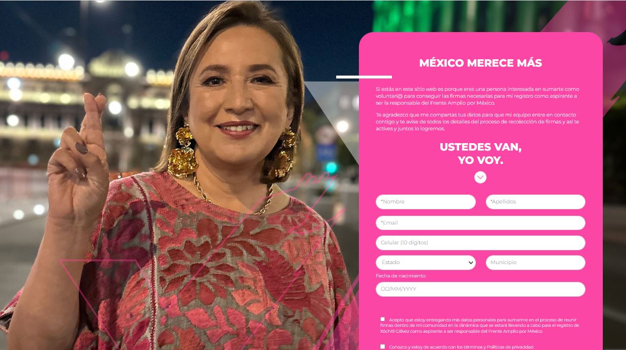 Luego de darse a conocer el proceso de selección de candidatos a la presidencia de la República por parte del Frente Amplio por México, la senadora Xóchitl Gálvez estableció un sitio de internet para que personas de manera voluntaria le ayuden a recolectar las 150 mil firmas en por lo menos 17 entidades federativas.