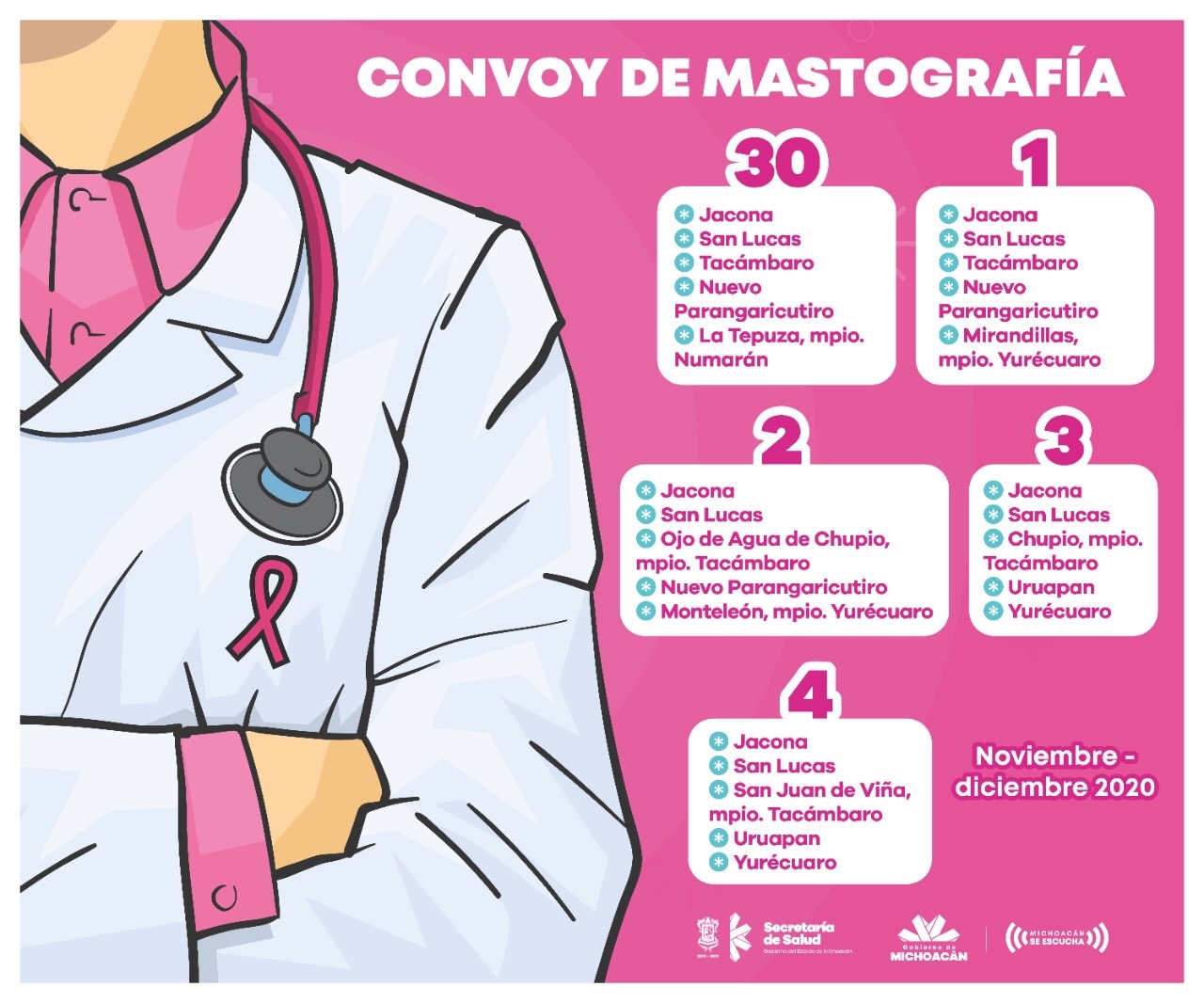 MORELIA MICH., 30 de noviembre de 2020.- Las unidades móviles para la detección oportuna del cáncer de mama, de la Secretaría de Salud de Michoacán (SSM), siguen su recorrido por las comunidades del estado, brindando atención gratuita a las mujeres de 40 a 69 años.