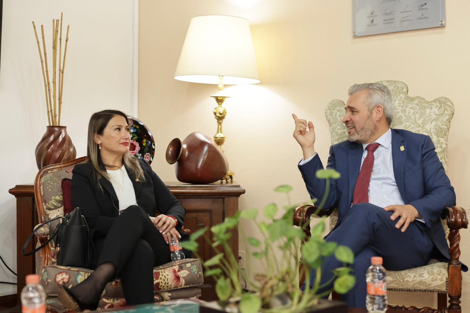 Morelia, Mich., 24 de octubre de 2023.- El gobernador Alfredo Ramírez Bedolla, y la jefa de la Brigada Investigadora de Trata de Personas de la Policía de Investigaciones de Chile, Katherine Alejandra Vázquez, compartieron experiencias de programas y acciones para mejorar la seguridad y prevención de la violencia.