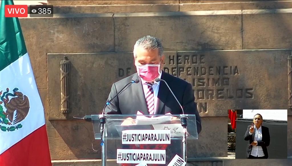 Los deudos de Julín, como era conocido Julio César Chagolla, irrumpieron minutos antes en la plaza “José María Morelos y Pavón” –El Caballito-, con pancartas y exigiendo justicia, ante funcionarios federales, estatales, municipales, empresarios e invitados del edil emanado de Morena.