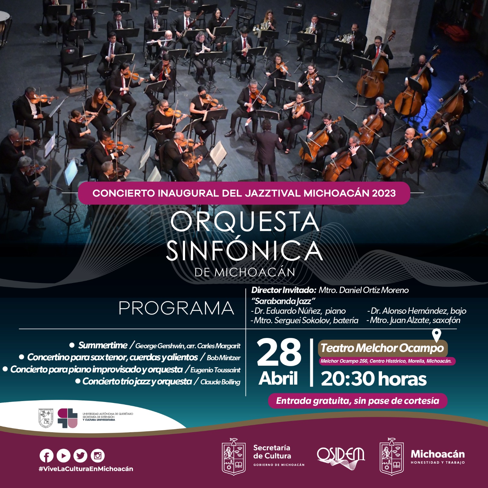 Morelia, Mich., 25 de abril de 2023.- En el marco del Día Internacional del Jazz, la Secretaría de Cultura de Michoacán (Secum) invita a disfrutar del gran concierto inaugural del Jazztival 2023 con la Orquesta Sinfónica de Michoacán (OSIDEM), el próximo 28 de abril en el Teatro Melchor Ocampo, a partir de las 20:30 horas.