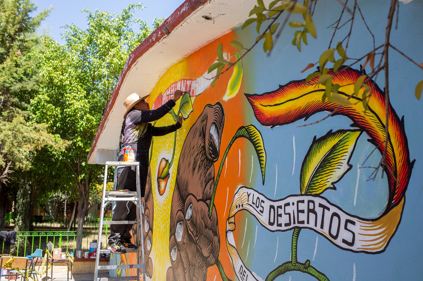 La alumna Cinthya Yunnuén Zoreque compartió la experiencia de 10 días de sus compañeras y compañeros durante la ejecución del mural en su escuela denominado «Serán refrescamos los desiertos del mundo», del artista Gabriel Ávalos Sánchez. «Nos gusta mucho ver el resultado y tener un mural lleno de color con mensaje en nuestra escuela. ¡Muchas gracias!», compartió.
