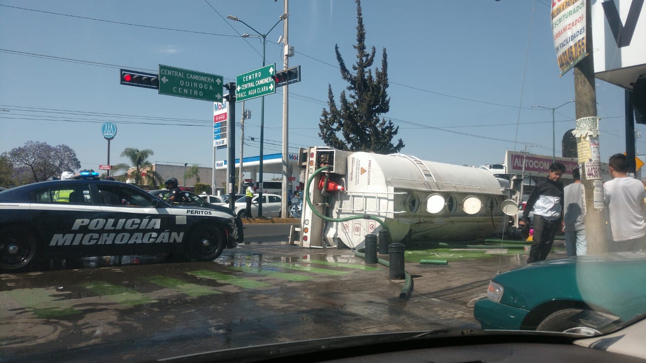 MORELIA MICH., 1 de abril.- Una pipa cargada con miles de litros de agua que se trasladaba en apoyo al incendio del Cuartel Valladolid, se volcó en la intersección de las avenidas Madero Poniente y Escuadrón 201.