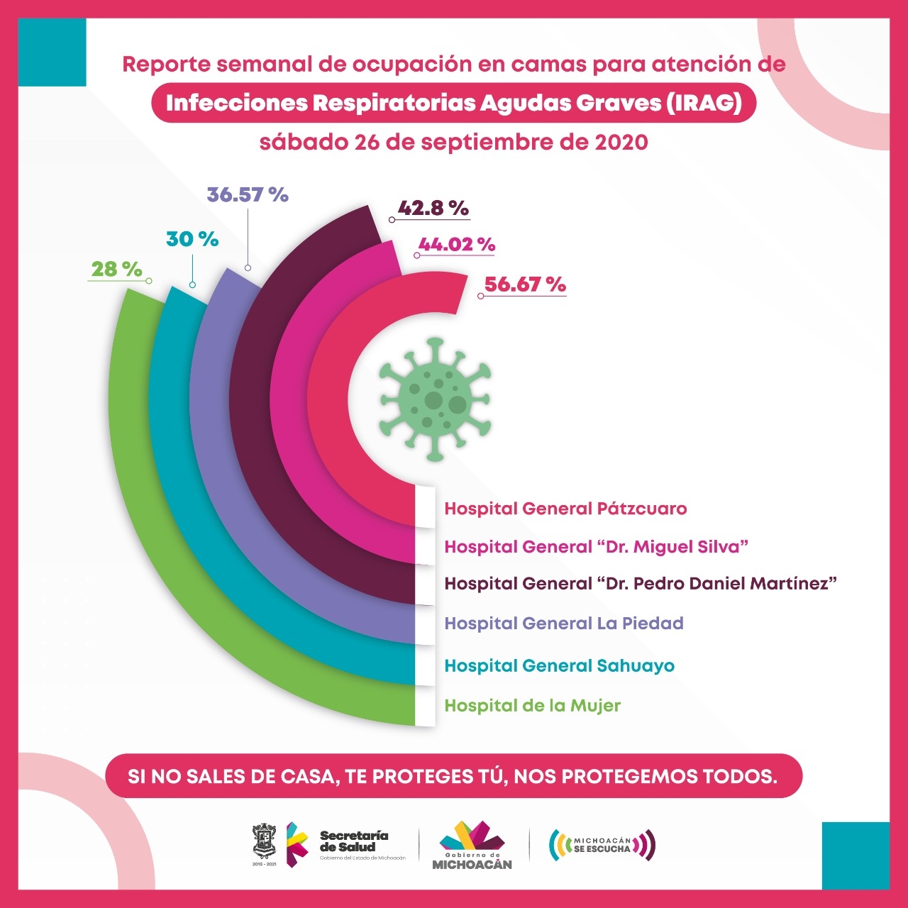 Morelia, Michoacán, a 26 de septiembre de 2020.- Derivado del comportamiento epidemiológico de COVID-19, las camas reconvertidas para la atención de infecciones Respiratorias Agudas Graves (IRAG), de 6 hospitales de la Secretaría de Salud de Michoacán (SSM), registran una ocupación de entre 28 y 56.67 por ciento.