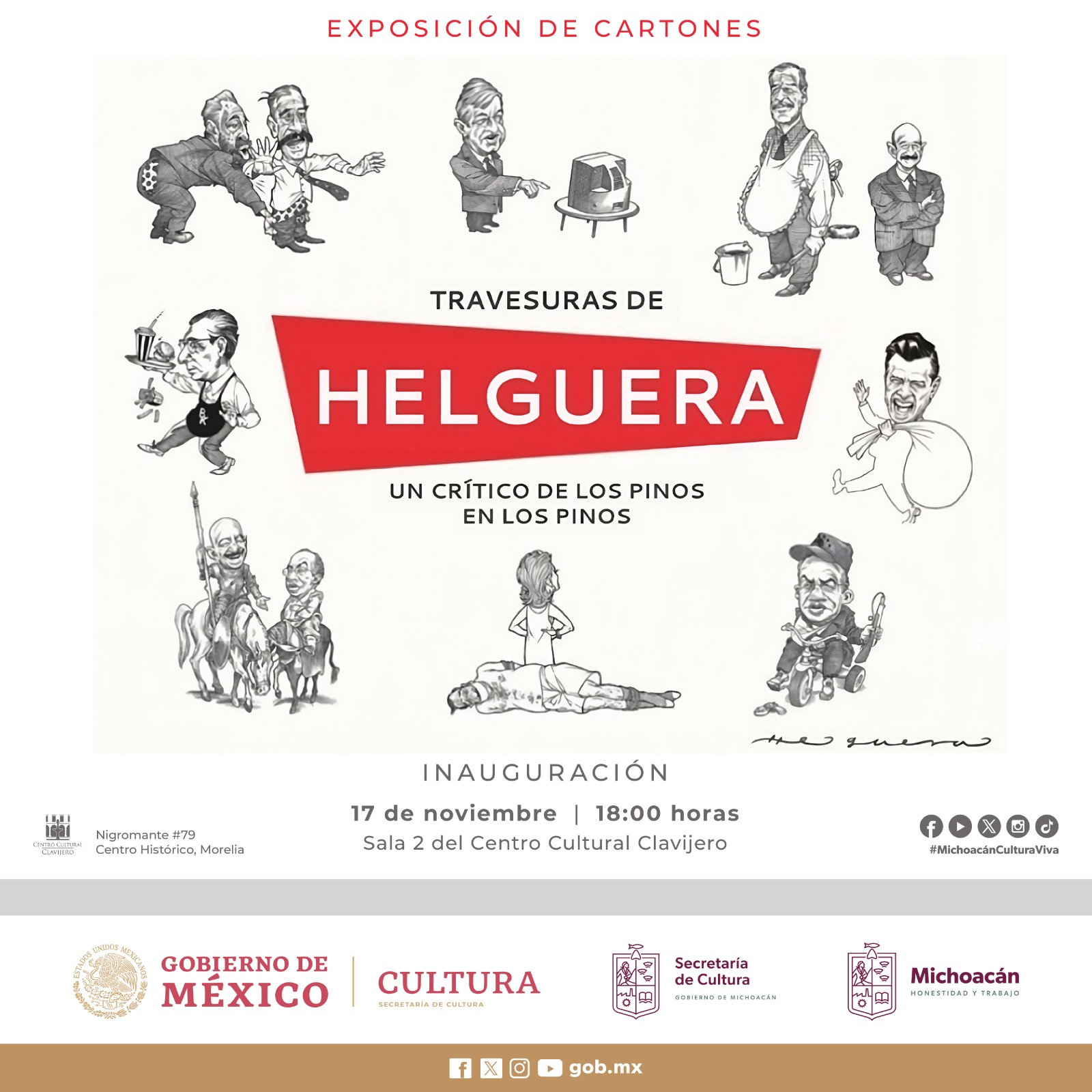 Travesuras de Helguera, un crítico de Los Pinos en Los Pinos, se inaugurará el 17 de noviembre a las 18:00 horas, en la Sala 2 del Clavijero, y permanecerá hasta el 29 de febrero de 2024, que se encuentra en la calle Nigromante 79, en el Centro Histórico de Morelia.