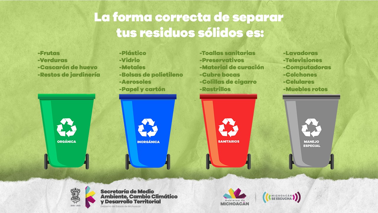 La forma correcta de separar los residuos desde el hogar es tan sencilla, abundó Luna García, quien recordó que deben ser: Orgánicos: considerados los residuos sólidos biodegradables, restos de frutas y verduras, cascarón de huevo, restos de jardinería y se identifican con el color verde.