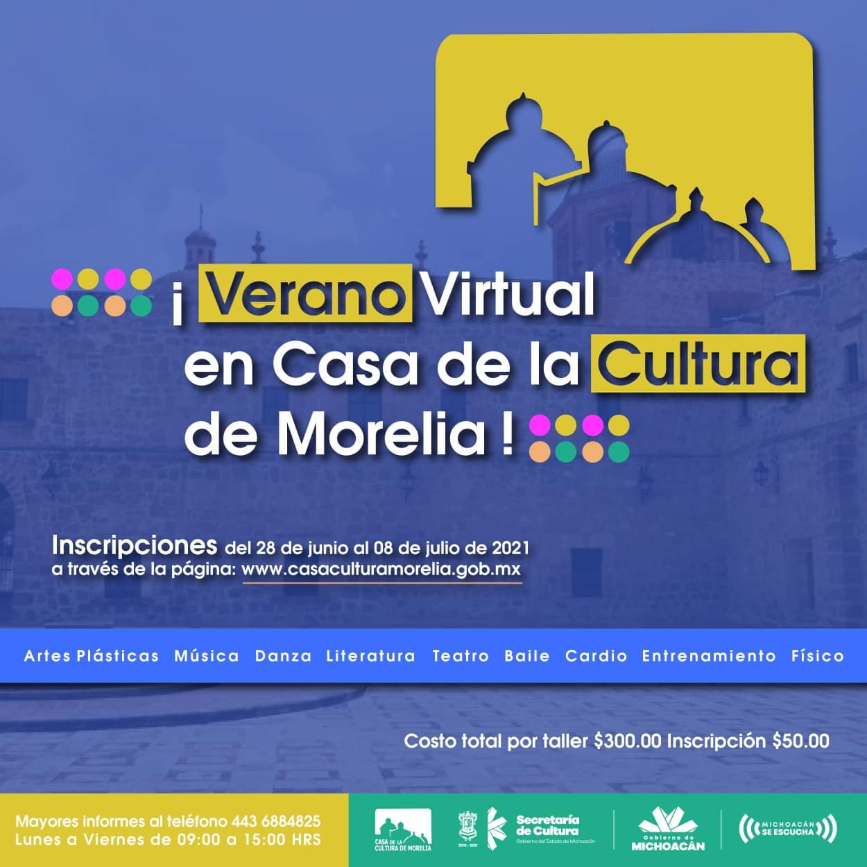 Morelia, Michoacán, a 1 de julio de 2021.– Un verano lleno de arte podrán disfrutar chicos y grandes, a través de los talleres virtuales de la Casa de la Cultura de Morelia, cuyas inscripciones se encuentran abiertas a partir del 28 de junio, y cerrarán el 8 de julio.