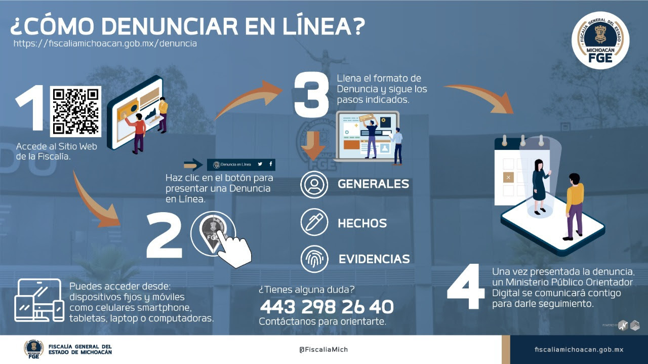 Para hacer uso de este servicio es necesario ingresar al portal oficial de la FGE www.fiscaliamichoacan.gob.mx; posteriormente hacer clic en el botón de presentar Denuncia en Línea; y seguir los pasos que ahí se indican; una vez presentada, un Ministerio Público Orientador Digital se comunicará para dar seguimiento a dicho caso.