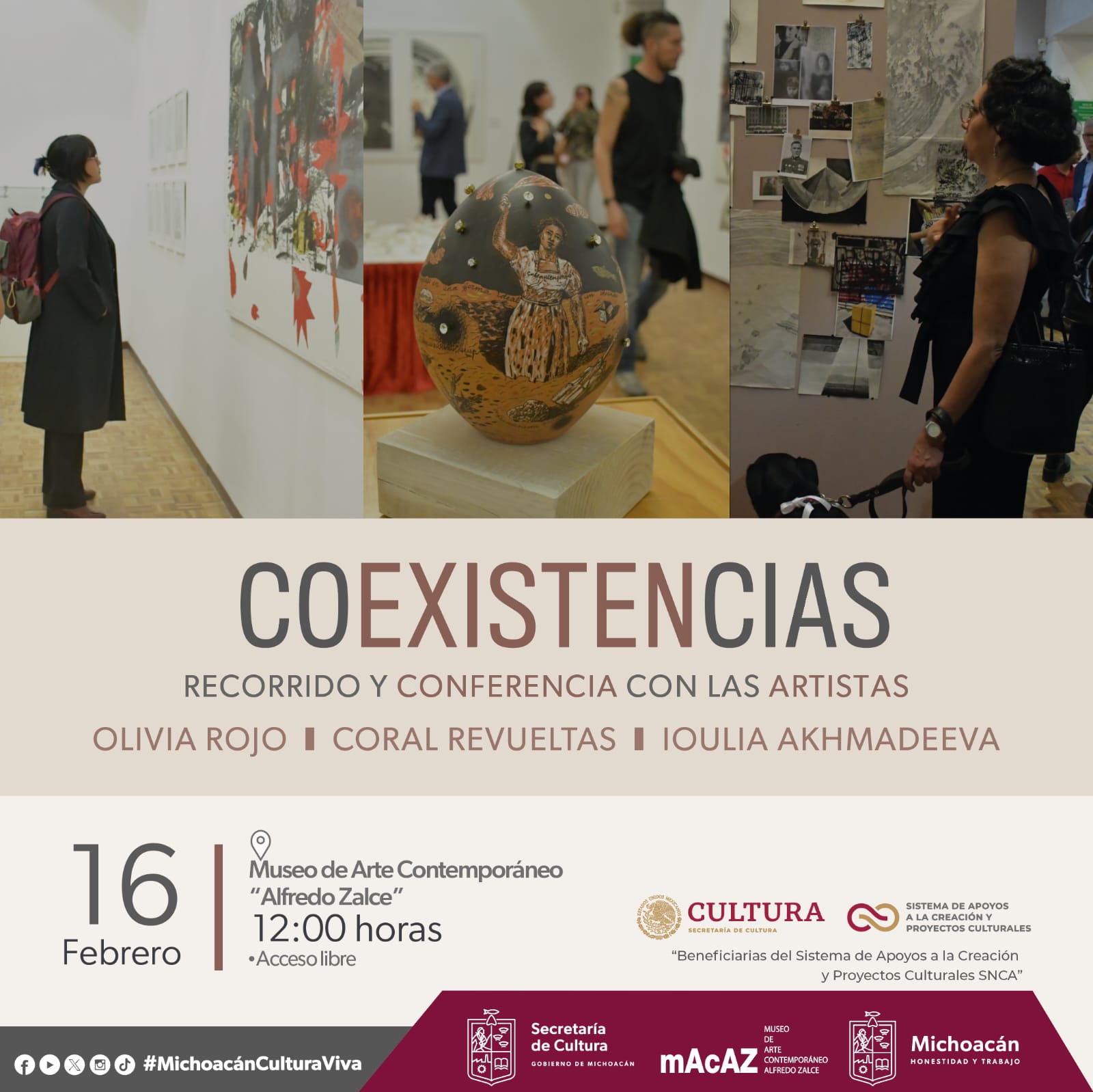 Morelia, Mich., 13 de febrero de 2024.- Este 16 de febrero, a las 12 horas, acompaña a Olivia Rojo, Coral Revueltas y Ioulia Akhmadeeva, en un recorrido que ofrecerán en torno a la exposición de su autoría “Coexistencias”, que la Secretaría de Cultura de Michoacán presenta en el Museo de Arte Contemporáneo Alfredo Zalce (Macaz).
