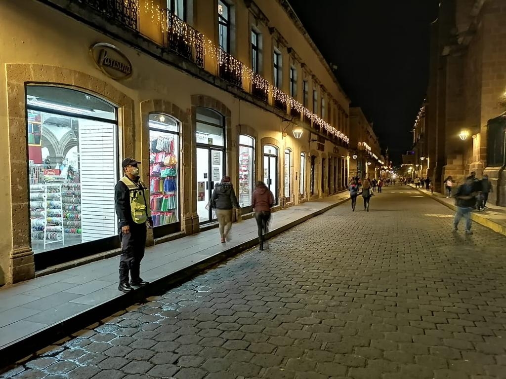 Elementos de la Policía Michoacán y Tránsito y Movilidad del Estado, efectúan recorridos en establecimientos comerciales, plazas públicas y sitios de mayor afluencia, supervisando que los cierres de las actividades no esenciales, se hayan efectuado desde las 19:00 horas.